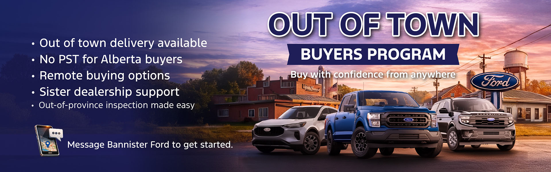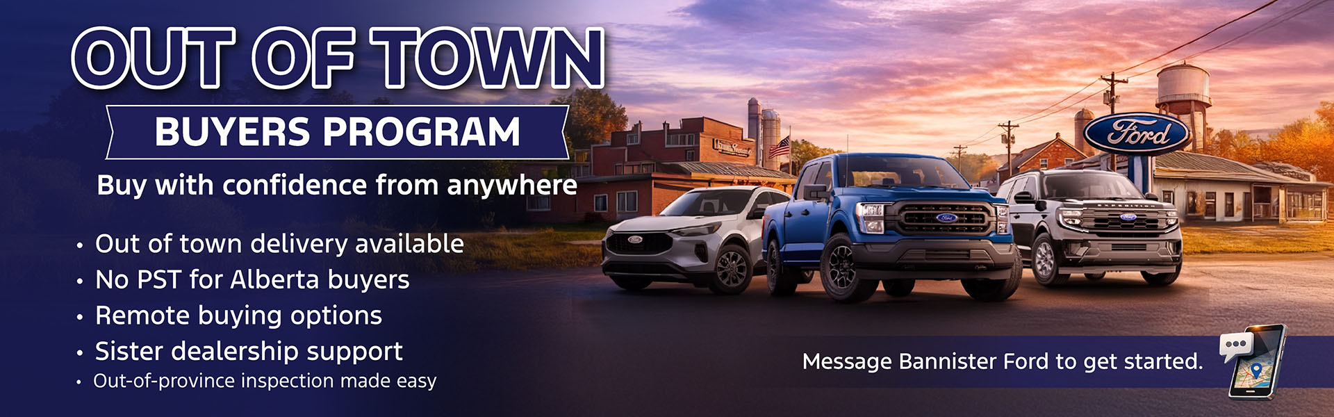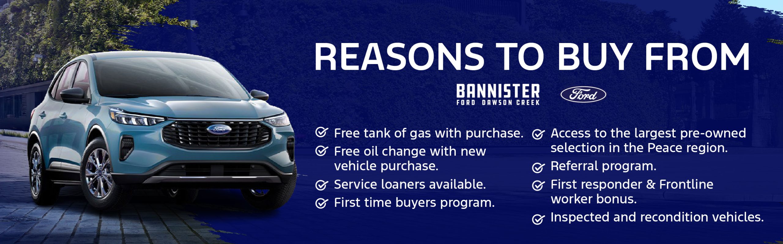 Bannister Ford is your preferred Dawson Creek car dealership, proudly serving Peace River County Ford customers. As the sole Ford dealership in Dawson Creek, BC, we welcome customers from all over British Columbia and Alberta, including Grande Prairie, Chetwynd, and Tumbler Ridge. Our friendly staff sell and service all makes of vehicles throughout the region, and the reason we are the best Ford dealer in the area. Accordingly, we specialize in out-of-town customers. Let us show you why we are the top dealership in Dawson Creek!